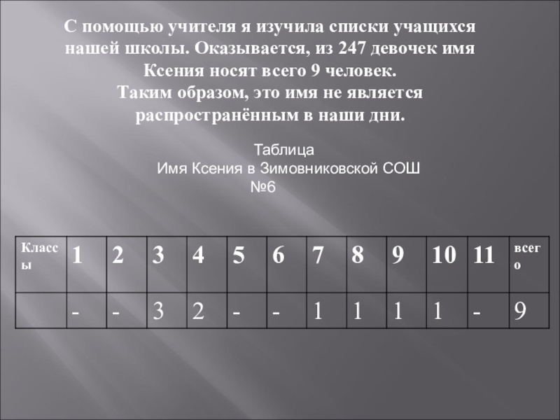 изучила списки учащихся нашей школы. Оказывается, из 247 девочек имя Ксения носят всего 9 человек.
