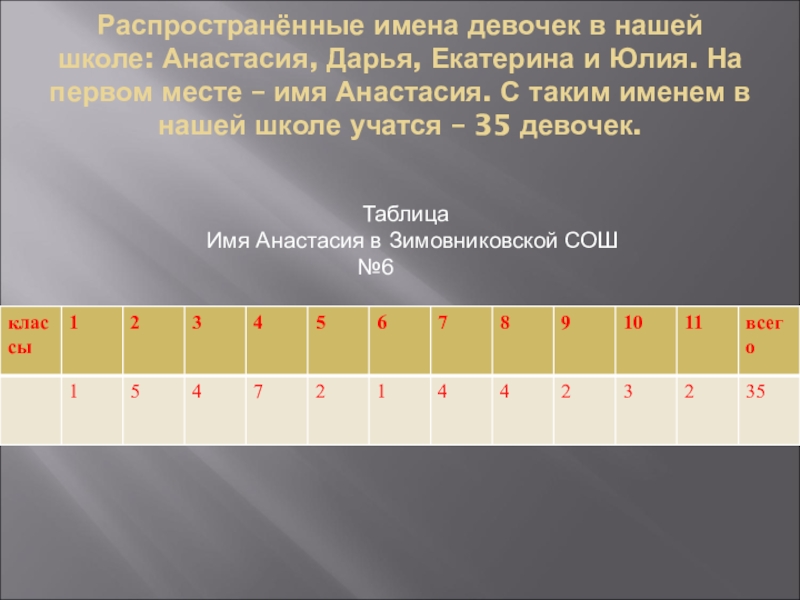 Слайд 24Распространённые имена девочек в нашей школе: Анастасия, Дарья, Екатерина и Юлия.