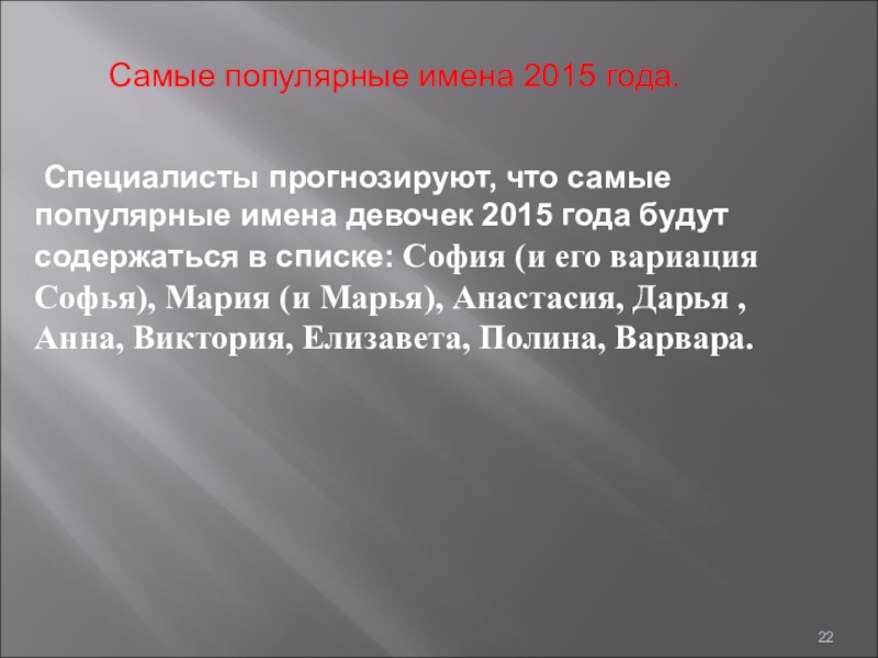 Слайд 22Самые популярные имена 2015 года.