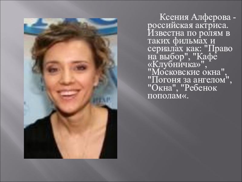 Слайд 18 Ксения Алферова - российская актриса. Известна по ролям в таких