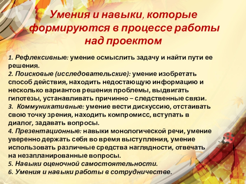 4. Презентационные: навыки монологической речи, умение уверенно держать себя во время выступления, умение использовать различные средства наглядности, отвечать на незапланированные вопросы.