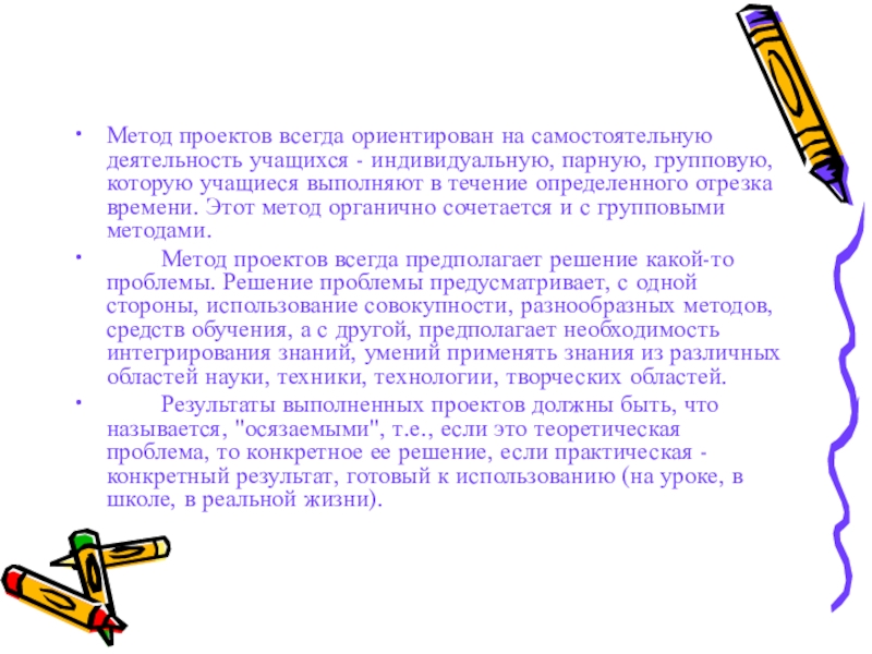 Слайд 5Метод проектов всегда ориентирован на самостоятельную деятельность учащихся - индивидуальную, парную,