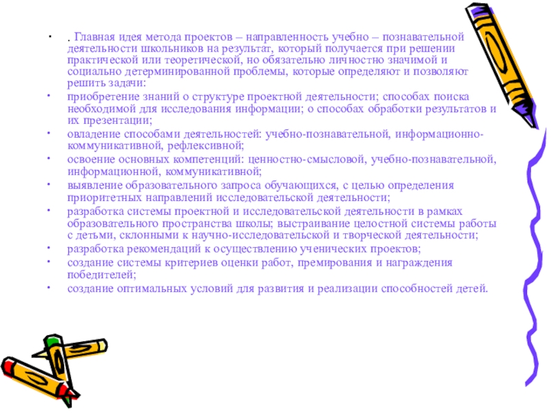 Слайд 6. Главная идея метода проектов – направленность учебно – познавательной деятельности