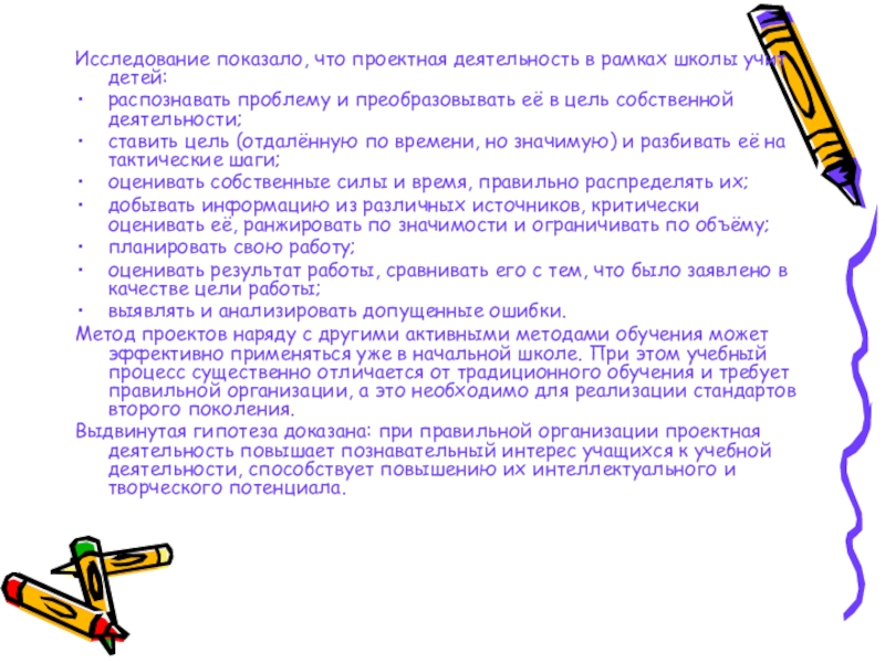 Слайд 13Исследование показало, что проектная деятельность в рамках школы учит детей: