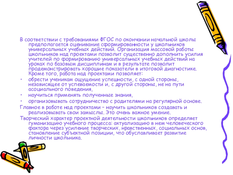 сформированности у школьников универсальных учебных действий. Организация массовой работы школьников над проектами позволит существенно дополнить усилия учителей по формированию универсальных учебных действий на уроках по базовым дисциплинам и в результате позволит продемонстрировать хорошие показатели в итоговой диагностике. Кроме того, работа над проектами позволяет: