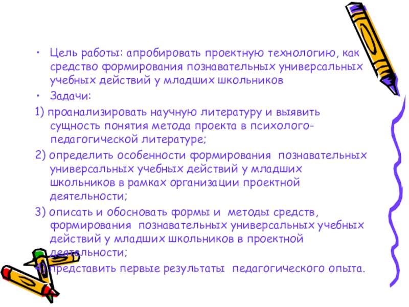 Слайд 2Цель работы: апробировать проектную технологию, как средство формирования познавательных универсальных учебных