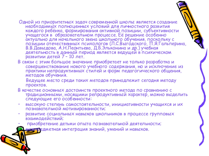 для личностного развития каждого ребёнка, формирования активной позиции, субъективности учащегося в образовательном процессе. Её решение особенно актуально для начального звена школьного обучения, поскольку с позиции отечественных психологов (Л.С.Выгодского, П.Я.Гальперина, В.В.Давыдова, А.Н.Леонтьева, Д.Б.Эльконина и др.) учебная деятельность в данный период является ведущей в психическом развитии детей 7 – 10 лет.