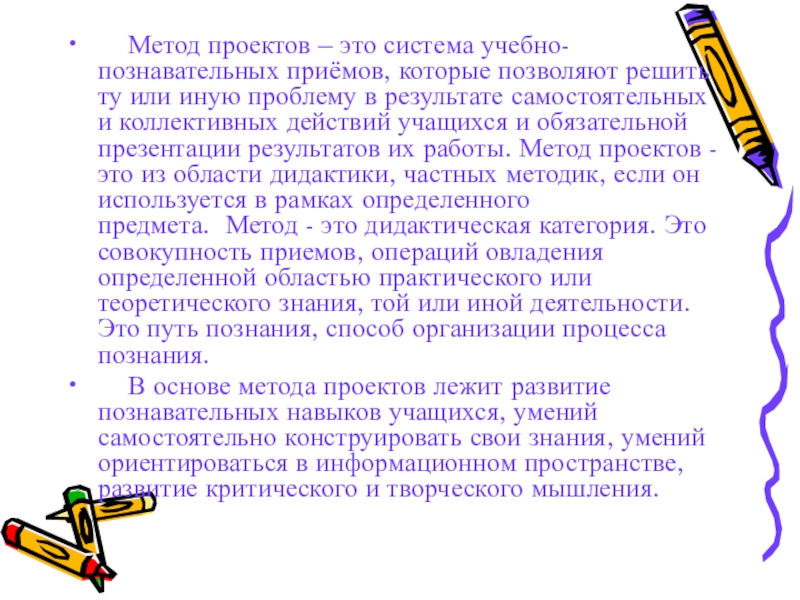 решить ту или иную проблему в результате самостоятельных и коллективных действий учащихся и обязательной презентации результатов их работы. Метод проектов - это из области дидактики, частных методик, если он используется в рамках определенного предмета. Метод - это дидактическая категория. Это совокупность приемов, операций овладения определенной областью практического или теоретического знания, той или иной деятельности. Это путь познания, способ организации процесса познания.