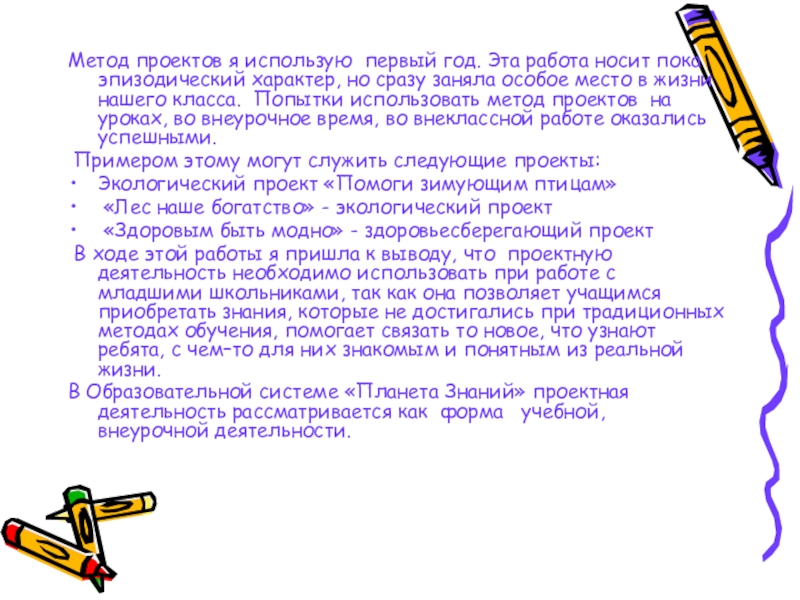 Слайд 11Метод проектов я использую первый год. Эта работа носит пока эпизодический