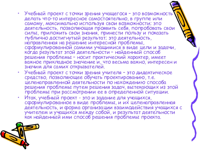 Слайд 9Учебный проект с точки зрения учащегося – это возможность делать что-то интересное самостоятельно,