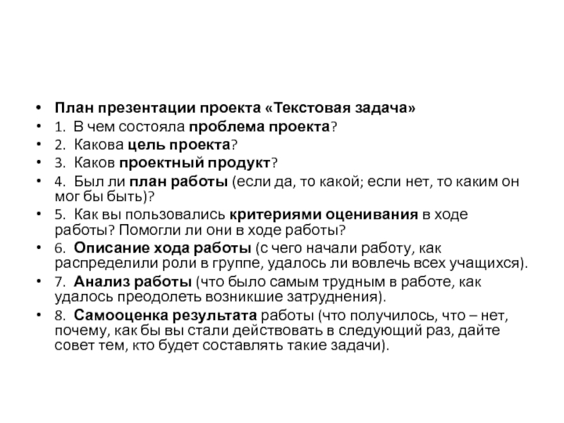 План презентации проекта «Текстовая задача»