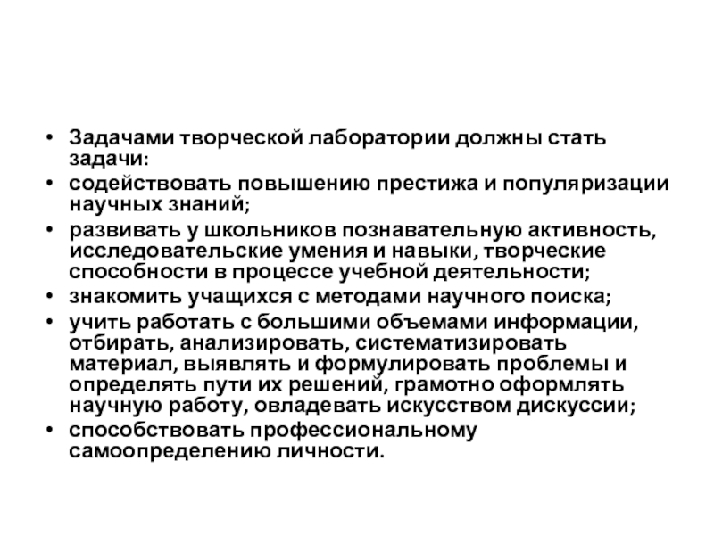 Задачами творческой лаборатории должны стать задачи: