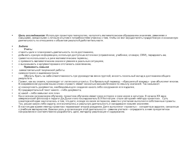 Цель исследования: Используя проектную технологию, наполнить математическое образование знаниями, умениями и