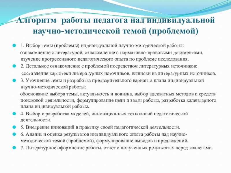 Слайд 16Алгоритм работы педагога над индивидуальной научно-методической темой (проблемой)