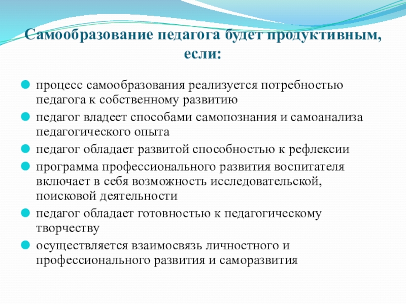 Слайд 14Самообразование педагога будет продуктивным, если:
