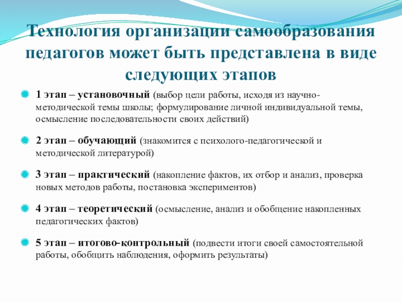 Слайд 8Технология организации самообразования педагогов может быть представлена в виде следующих этапов