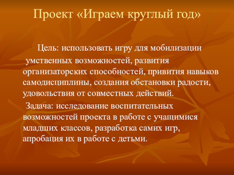 Задача: исследование воспитательных возможностей проекта в работе с учащимися младших классов, разработка самих игр, апробация их в работе с детьми.