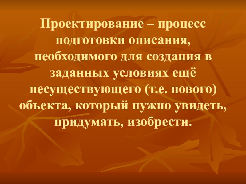 Проектирование – процесс подготовки описания, необходимого для создания в заданных условиях