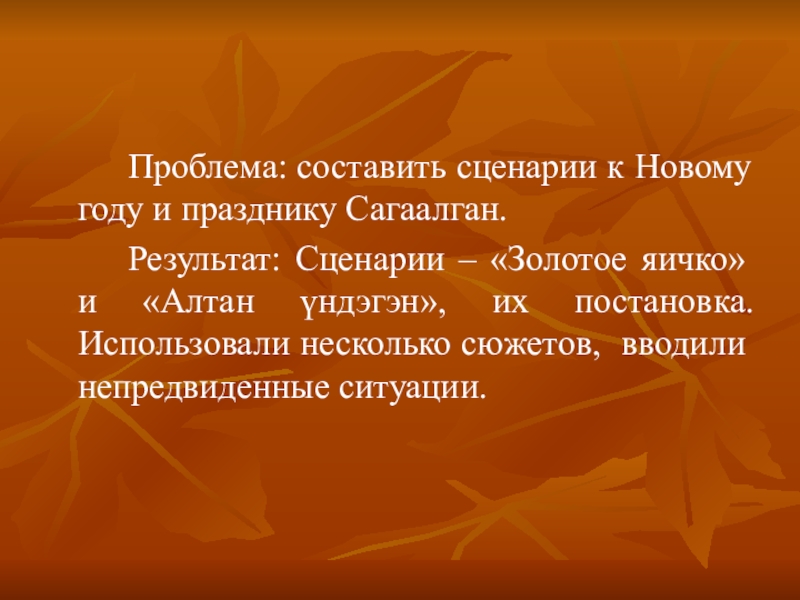 Проблема: составить сценарии к Новому году и празднику Сагаалган.