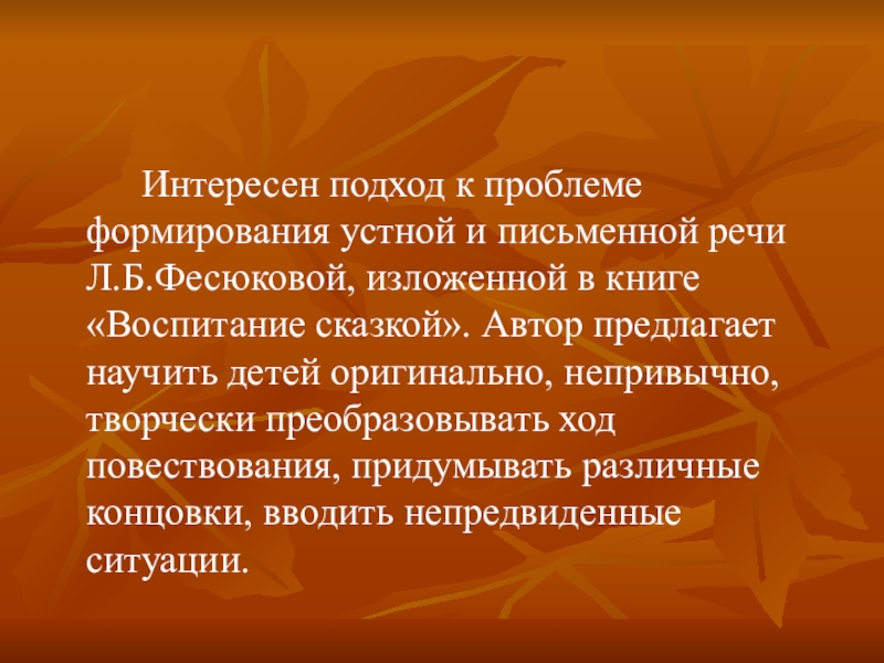в книге «Воспитание сказкой». Автор предлагает научить детей оригинально, непривычно, творчески преобразовывать ход повествования, придумывать различные концовки, вводить непредвиденные ситуации.