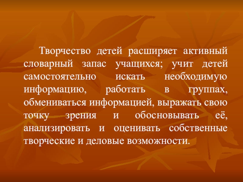 Творчество детей расширяет активный словарный запас учащихся; учит детей самостоятельно искать