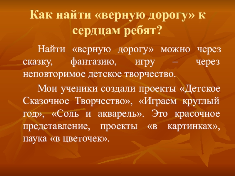 Мои ученики создали проекты «Детское Сказочное Творчество», «Играем круглый год», «Соль и акварель». Это красочное представление, проекты «в картинках», наука «в цветочек».