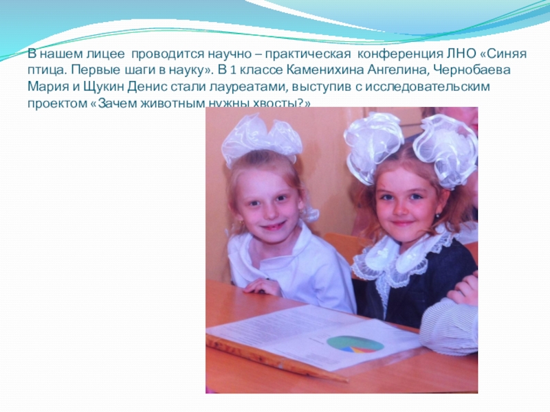 Первые шаги в науку». В 1 классе Каменихина Ангелина, Чернобаева Мария и Щукин Денис стали лауреатами, выступив с исследовательским проектом «Зачем животным нужны хвосты?»