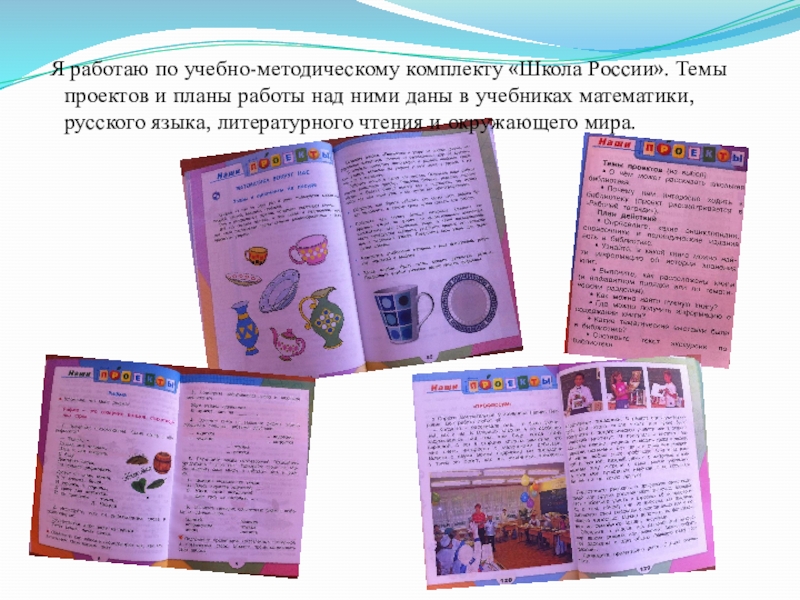 Я работаю по учебно-методическому комплекту «Школа России». Темы проектов и планы работы над ними даны в учебниках математики, русского языка, литературного чтения и окружающего мира.