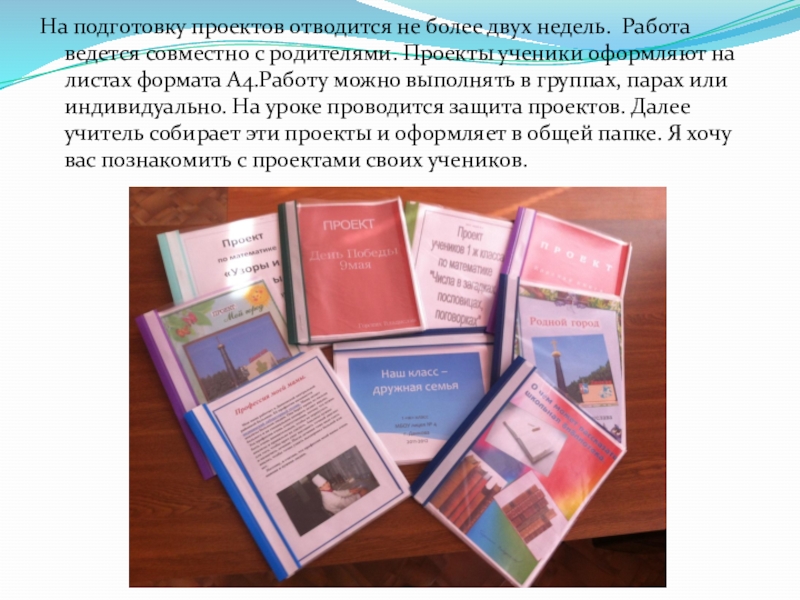 На подготовку проектов отводится не более двух недель. Работа ведется совместно с родителями. Проекты ученики оформляют на