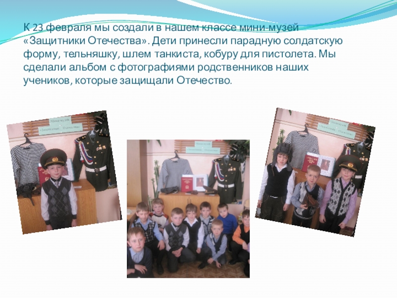 Слайд 8К 23 февраля мы создали в нашем классе мини-музей «Защитники Отечества».