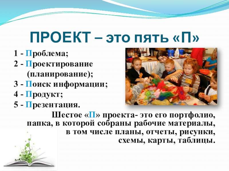 Шестое «П» проекта- это его портфолио, папка, в которой собраны рабочие материалы, в том числе планы, отчеты, рисунки, схемы, карты, таблицы.