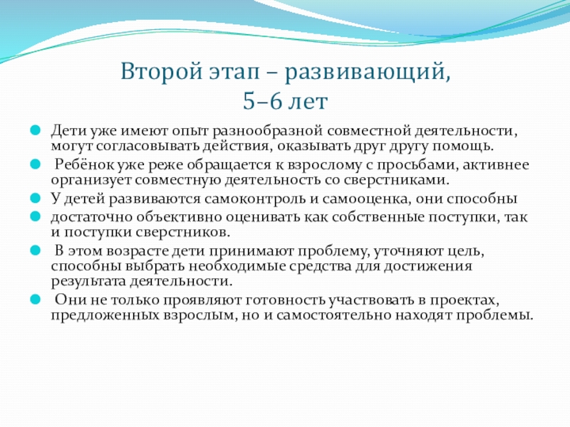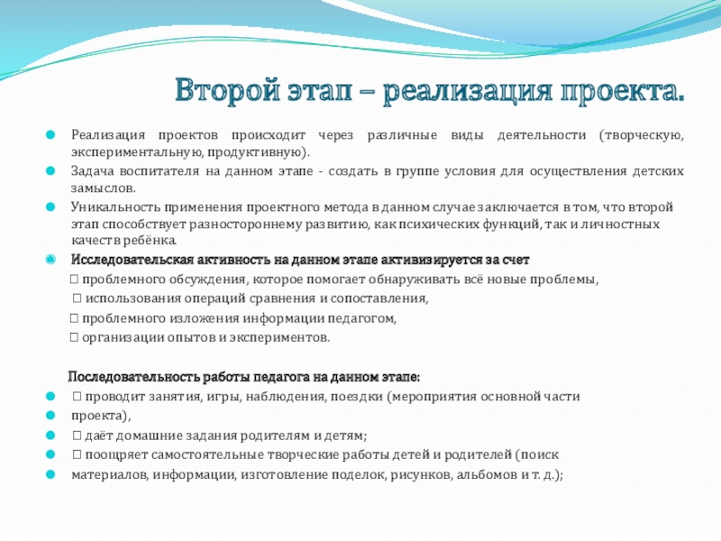 Уникальность применения проектного метода в данном случае заключается в том, что второй этап способствует разностороннему развитию, как психических функций, так и личностных качеств ребёнка.