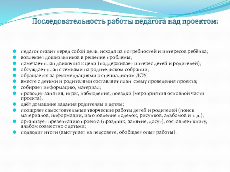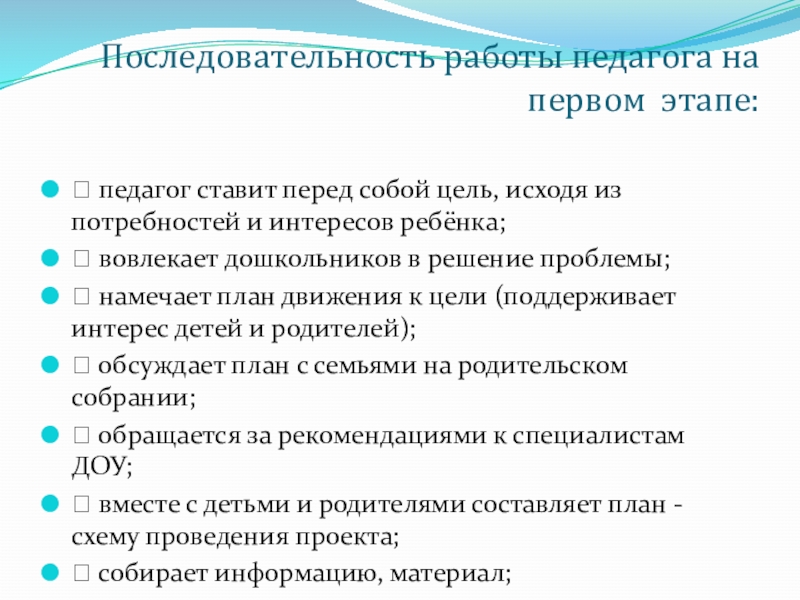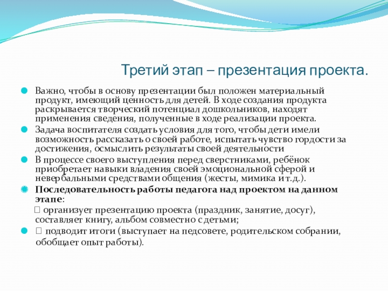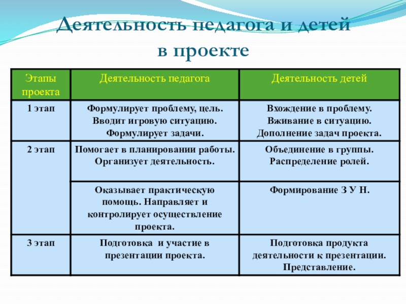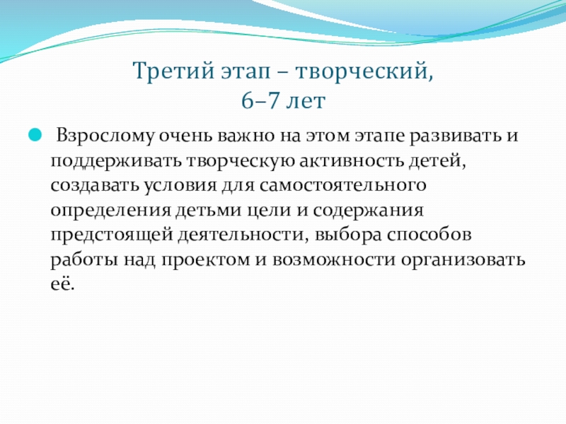 этапе развивать и поддерживать творческую активность детей, создавать условия для самостоятельного определения детьми цели и содержания предстоящей деятельности, выбора способов работы над проектом и возможности организовать её.