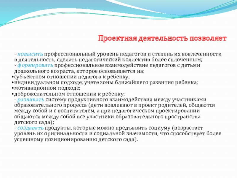 - развивать систему продуктивного взаимодействия между участниками образовательного процесса (дети вовлекают в проект родителей, общаются между собой и с воспитателем, а при педагогическом проектировании общаются между собой все участники образовательного пространства детского сада);