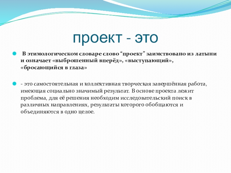 - это самостоятельная и коллективная творческая завершённая работа, имеющая социально значимый результат. В основе проекта лежит проблема, для её решения необходим исследовательский поиск в различных направлениях, результаты которого обобщаются и объединяются в одно целое.