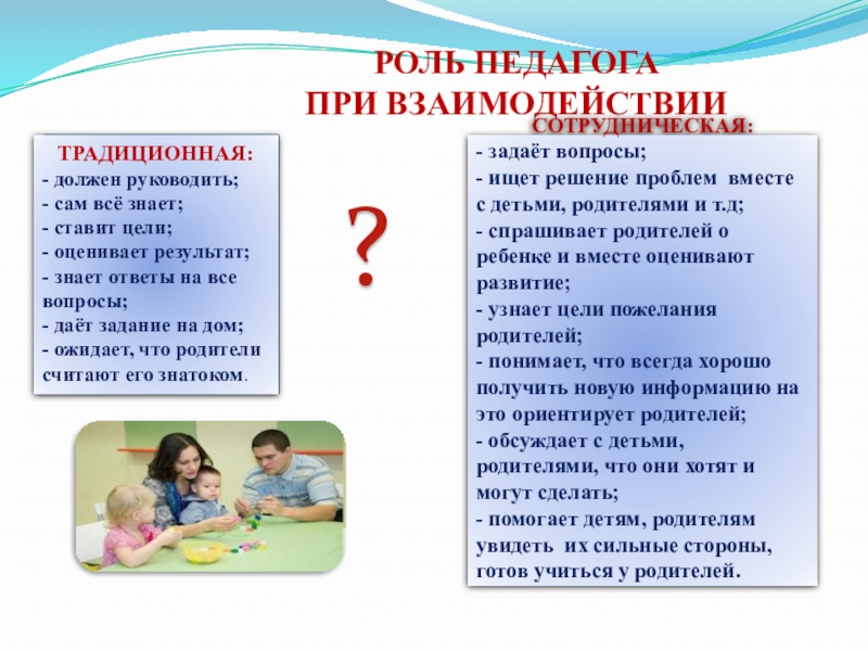- помогает детям, родителям увидеть их сильные стороны, готов учиться у родителей.