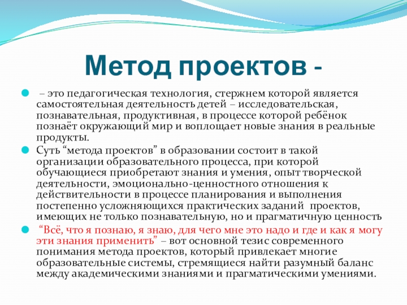 “Всё, что я познаю, я знаю, для чего мне это надо и где и как я могу эти знания применить” – вот основной тезис современного понимания метода проектов, который привлекает многие образовательные системы, стремящиеся найти разумный баланс между академическими знаниями и прагматическими умениями.