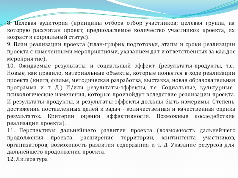 10. Ожидаемые результаты и социальный эффект (результаты-продукты, т.е. Новые, как правило, материальные объекты, которые появятся в ходе реализации проекта (книга, фильм, методическая разработка, выставка, новая образовательная программа и т. Д.) И/или результаты-эффекты, т.е. Социальные, культурные, психологические изменения, которые произойдут вследствие реализации проекта. И результаты-продукты, и результаты-эффекты должны быть измеримы. Степень достижения поставленных целей и задач - количественная и качественная оценка результатов. Критерии оценки эффективности. Возможные последействия реализации проекта).