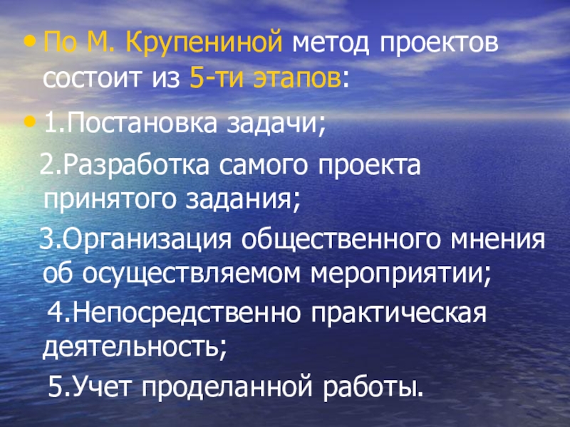 Слайд 10По М. Крупениной метод проектов состоит из 5-ти этапов: