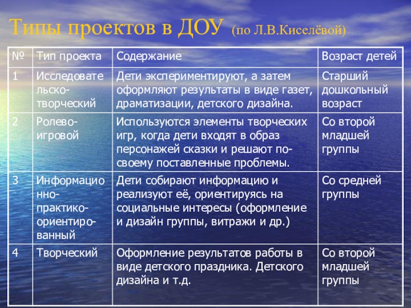 Слайд 17Типы проектов в ДОУ (по Л.В.Киселёвой)