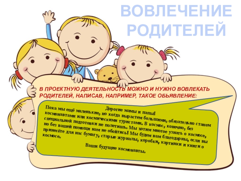 Пока мы ещё маленькие, но когда вырастем большими, обязательно станем космонавтами или космическими туристами. В космос, конечно, без специальной подготовки не полетишь. Мы хотим многое узнать о космосе, но без вашей помощи нам не обойтись! Мы будем вам благодарны, если вы принесёте для нас бумагу, старые журналы, коробки, картинки и книги о космосе.