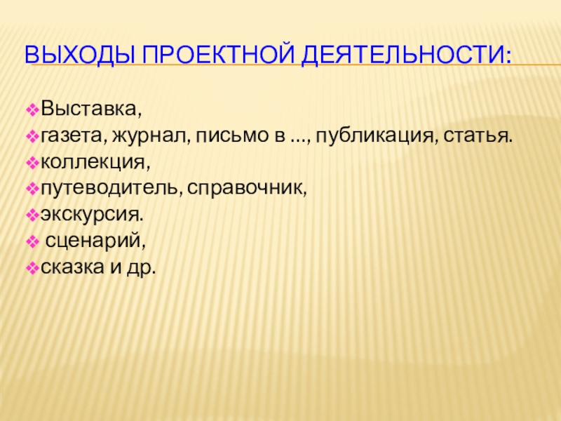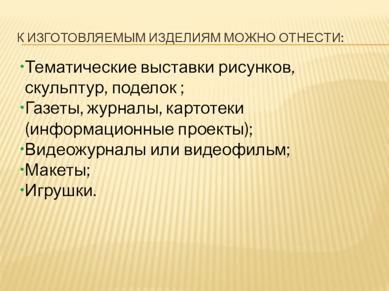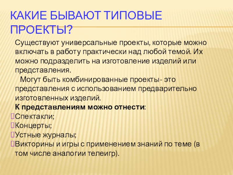 практически над любой темой. Их можно подразделить на изготовление изделий или представления.