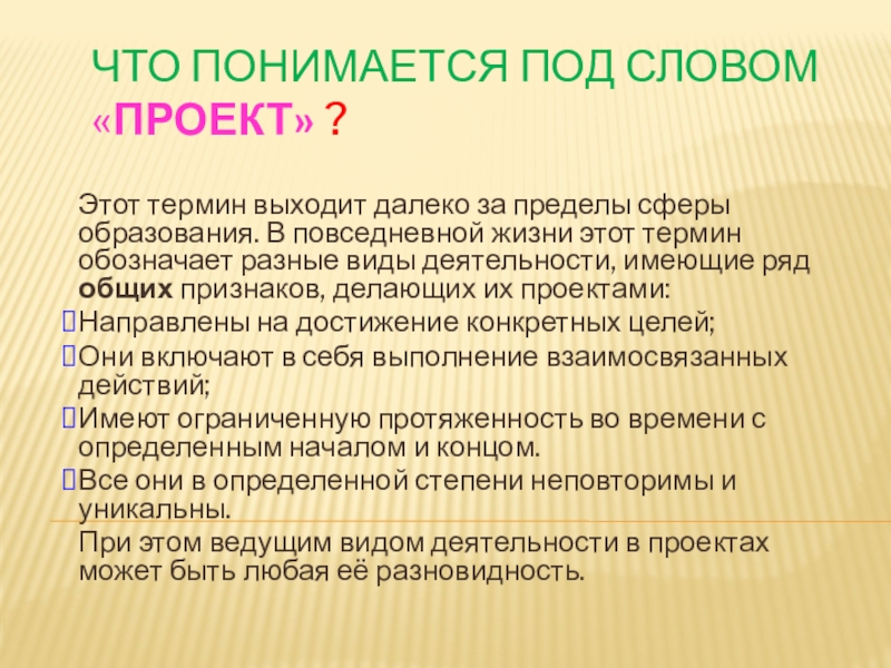 сферы образования. В повседневной жизни этот термин обозначает разные виды деятельности, имеющие ряд общих признаков, делающих их проектами: