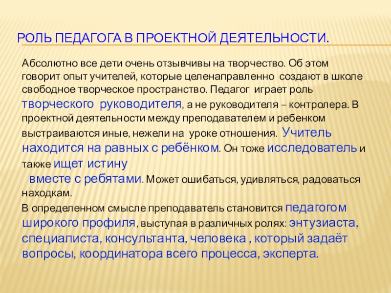 Об этом говорит опыт учителей, которые целенаправленно создают в школе свободное творческое пространство. Педагог играет роль творческого руководителя, а не руководителя – контролера. В проектной деятельности между преподавателем и ребенком выстраиваются иные, нежели на уроке отношения. Учитель находится на равных с ребёнком. Он тоже исследователь и также ищет истину