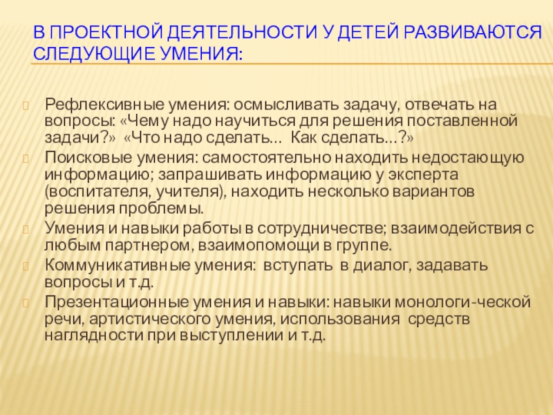 Слайд 3В проектной деятельности у детей развиваются следующие умения: