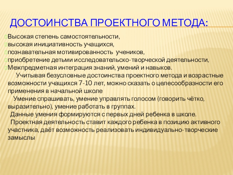 Учитывая безусловные достоинства проектного метода и возрастные возможности учащихся 7-10 лет, можно сказать о целесообразности его применения в начальной школе