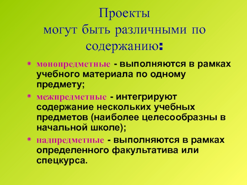 межпредметные - интегрируют содержание нескольких учебных предметов (наиболее целесообразны в начальной школе);