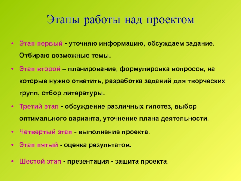Этап второй – планирование, формулировка вопросов, на которые нужно ответить, разработка заданий для творческих групп, отбор литературы.
