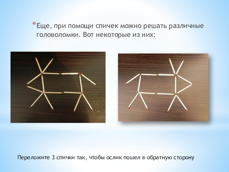 Переложите 3 спички так, чтобы ослик пошел в обратную сторону