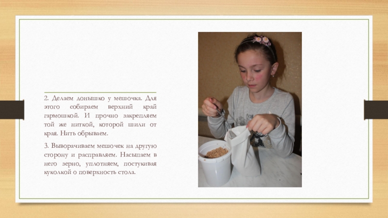 3. Выворачиваем мешочек на другую сторону и расправляем. Насыпаем в него зерно, уплотняем, постукивая куколкой о поверхность стола.